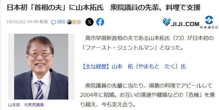 据日本时事通讯社报道,21日,日本自民党总裁高市早苗当选日本第104任首相,比她大9岁、现年73岁的山本拓也成为日本历史上首位“第一先生”。山本拓1952年7月出生于福井县,1990年首次当选众议员,共任职8届。他与高市同隶属自民党旧森派(清和政策研究会)。2004年,他与高市结婚。2017年,两人以“政治立场差异”为由协议离婚。